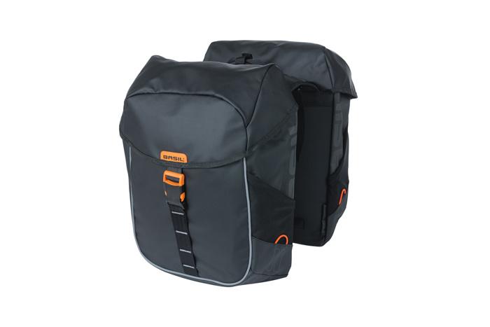Basil Miles Tarpaulin je športová dvojitá taška na bicykel čiernej farby s oranžovými detailmi. Taška na bicykel je vyrobená z matného čierneho materiálu a má objem 34 litrov. Po stranách tašky sú dve extra elastické vrecká ideálne na prepravu fľaše alebo kompaktného pršiplášťa. Vďaka tomu je taška ideálna na krátku alebo dlhú rekreačnú jazdu na bicykli alebo na cyklistickú dovolenku! Ak náhle začne pršať, vaše veci zostanú suché – taška je nepremokavá a má podlepené švy a kryt na vrchu.