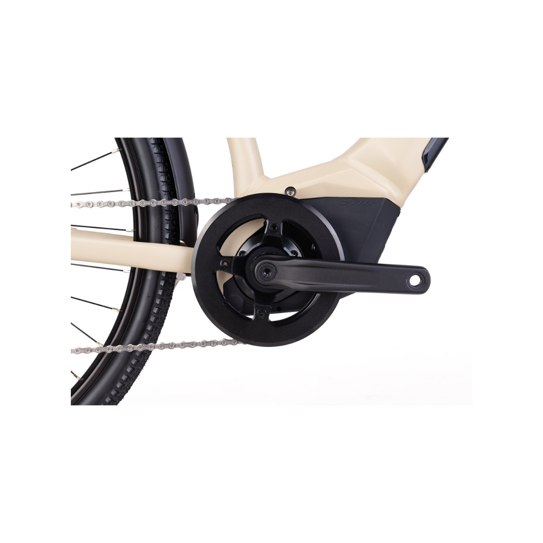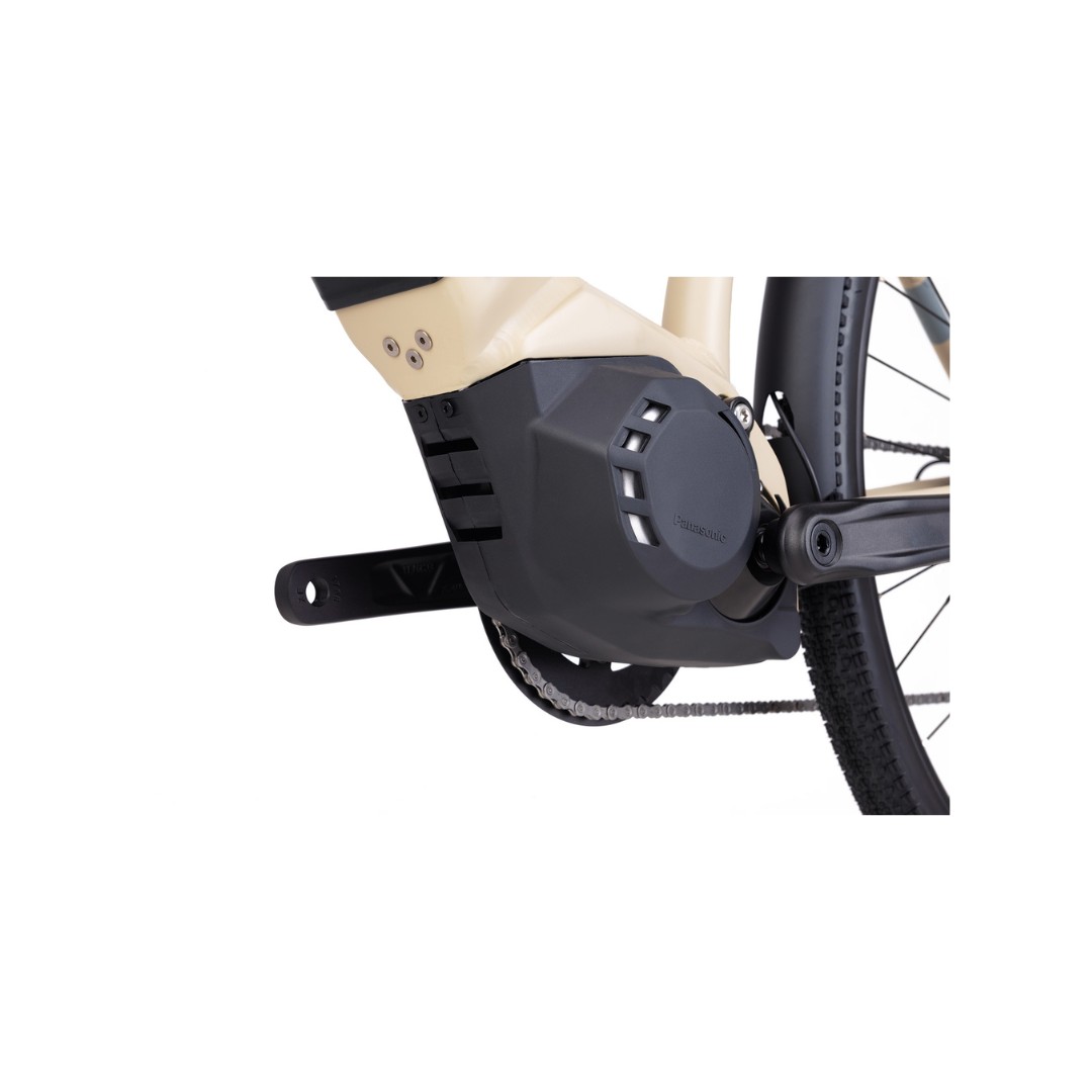 Srdcom bicykla je japonský stredový motor Panasonic GX Power Plus, ktorý poskytuje výkon 250 W a krútiaci moment až 75 Nm. Tento motor je známy svojou spoľahlivosťou, tichým chodom a prirodzeným nástupom výkonu. Podpora je plynulá a intuitívna, čo ocení každá cyklistka pri stúpaniach aj dlhých trasách. Motor je navrhnutý tak, aby optimálne prenášal silu šliapania a zároveň šetril energiu batérie.